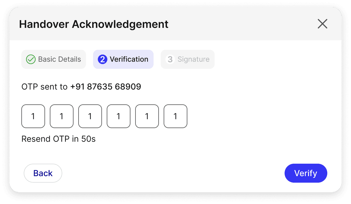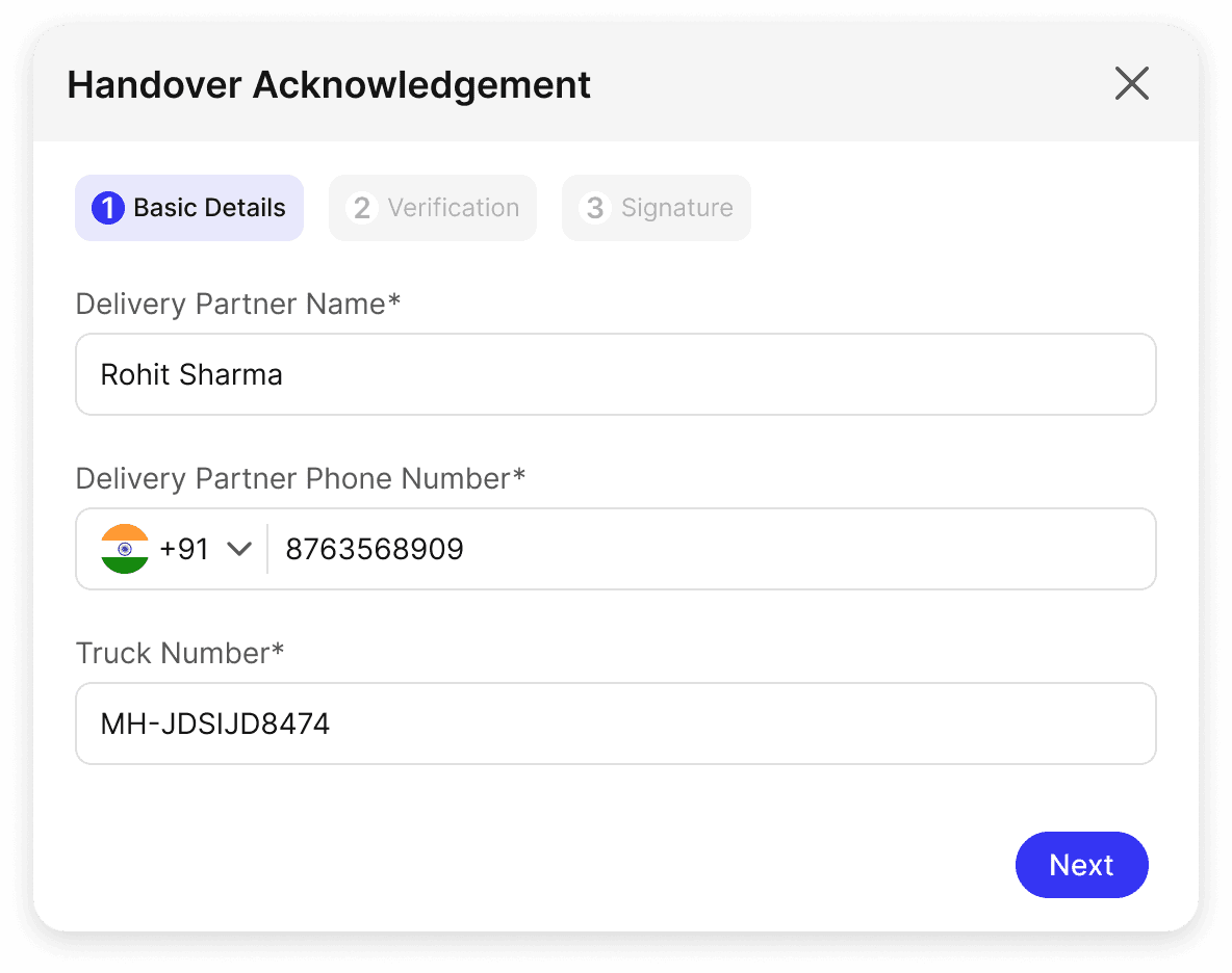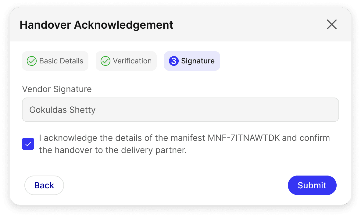 Delivery partner details are validated, and vendor consent is recorded to ensure accurate handoff and mutual transparency.