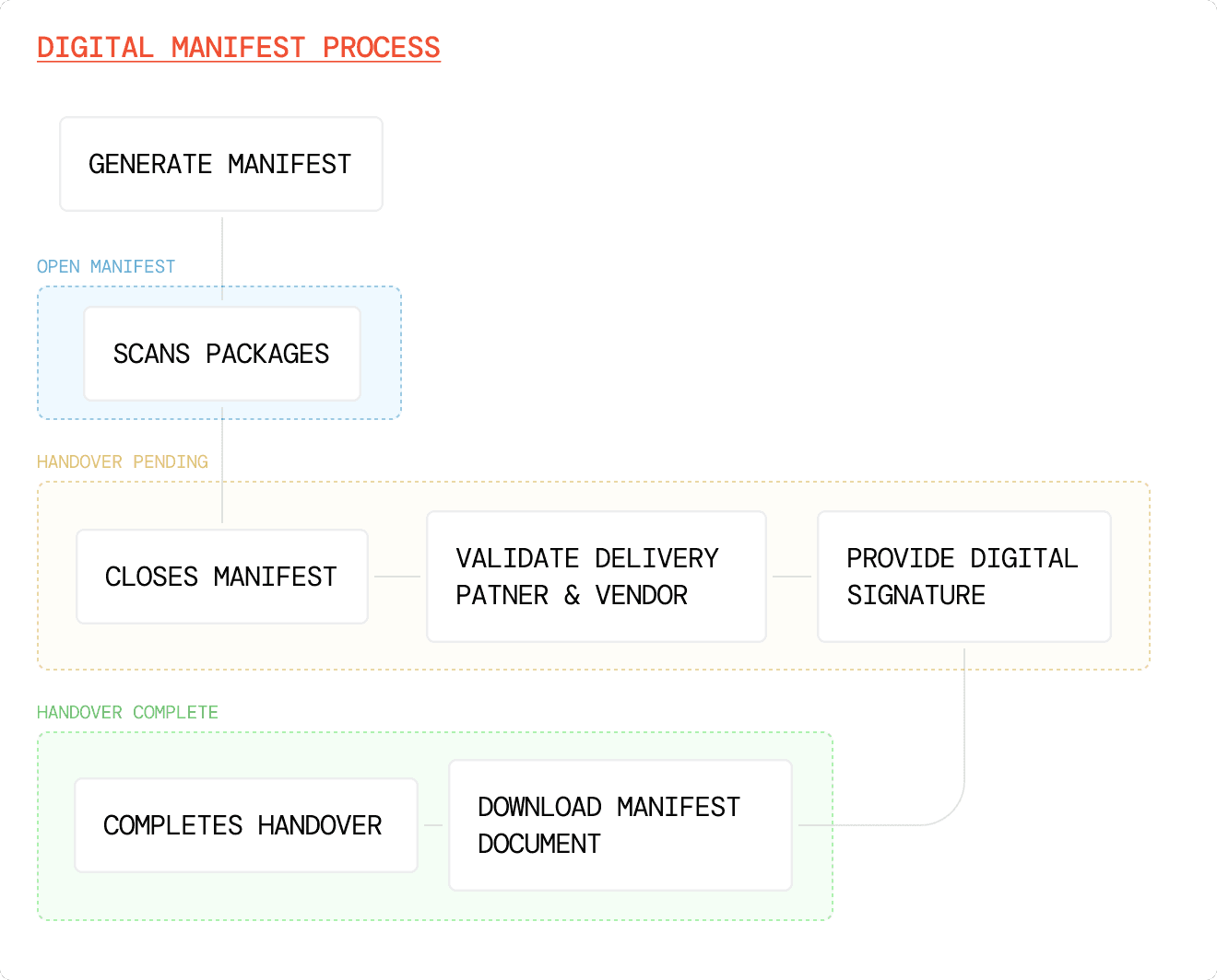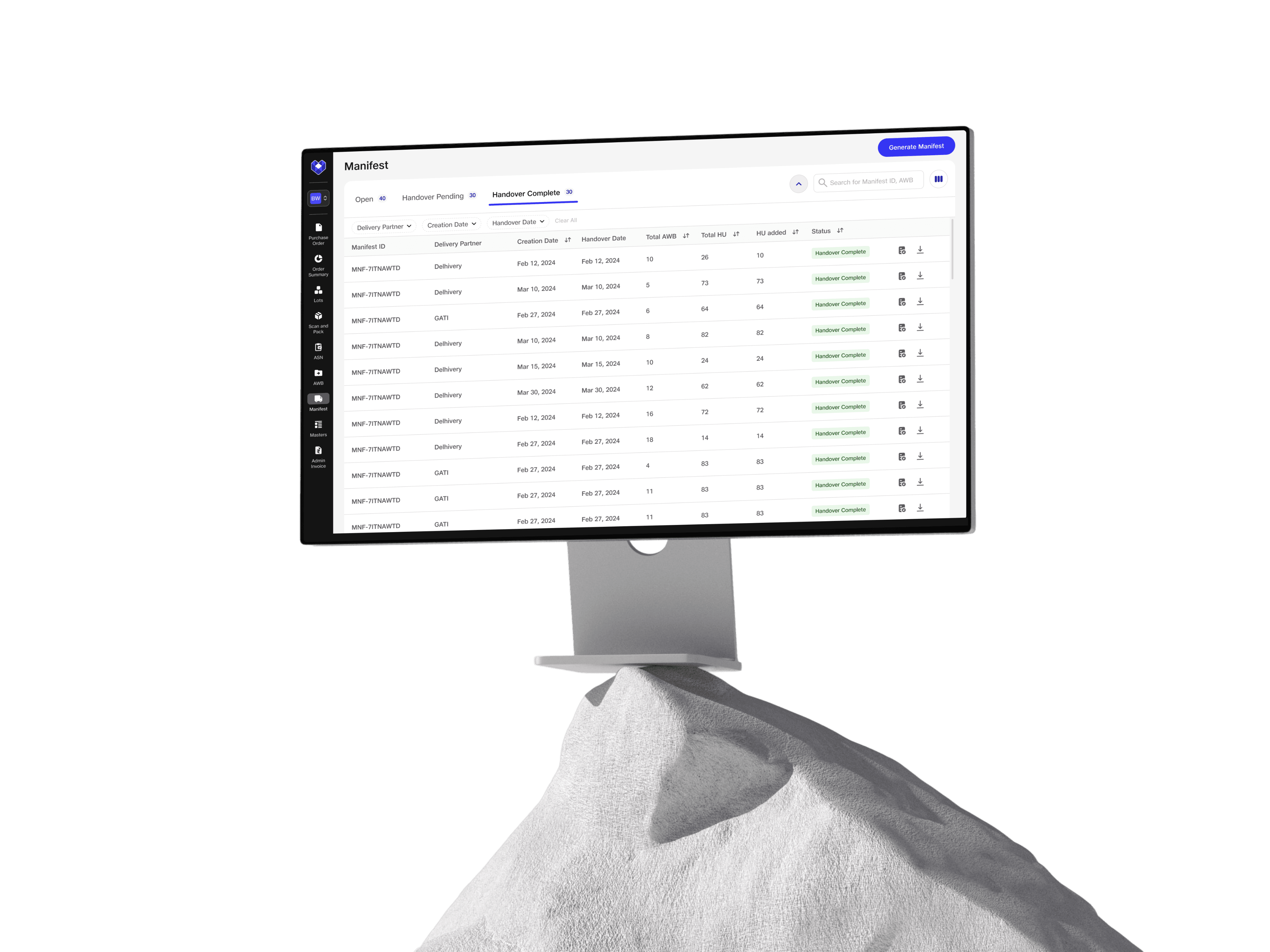 A dedicated dashboard provides a single source of truth for all manifests. It displays real-time statuses for each manifest along with crucial metadata. This gives vendor teams full visibility and control over the entire handover lifecycle.