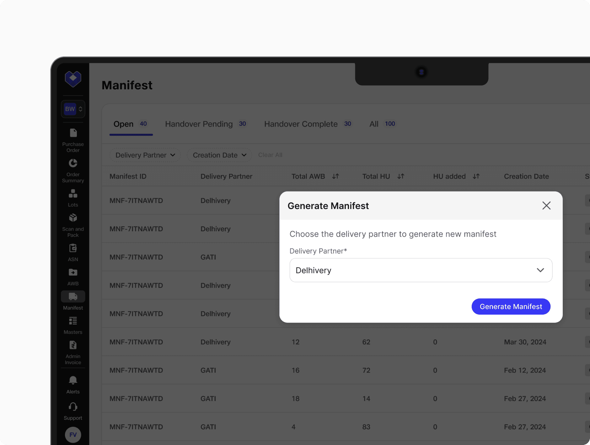 Warehouse staff get an up-to-date list of packages mapped to the selected delivery partner. They can generate a digital manifest removing guesswork and ensuring every handover starts with accuracy.