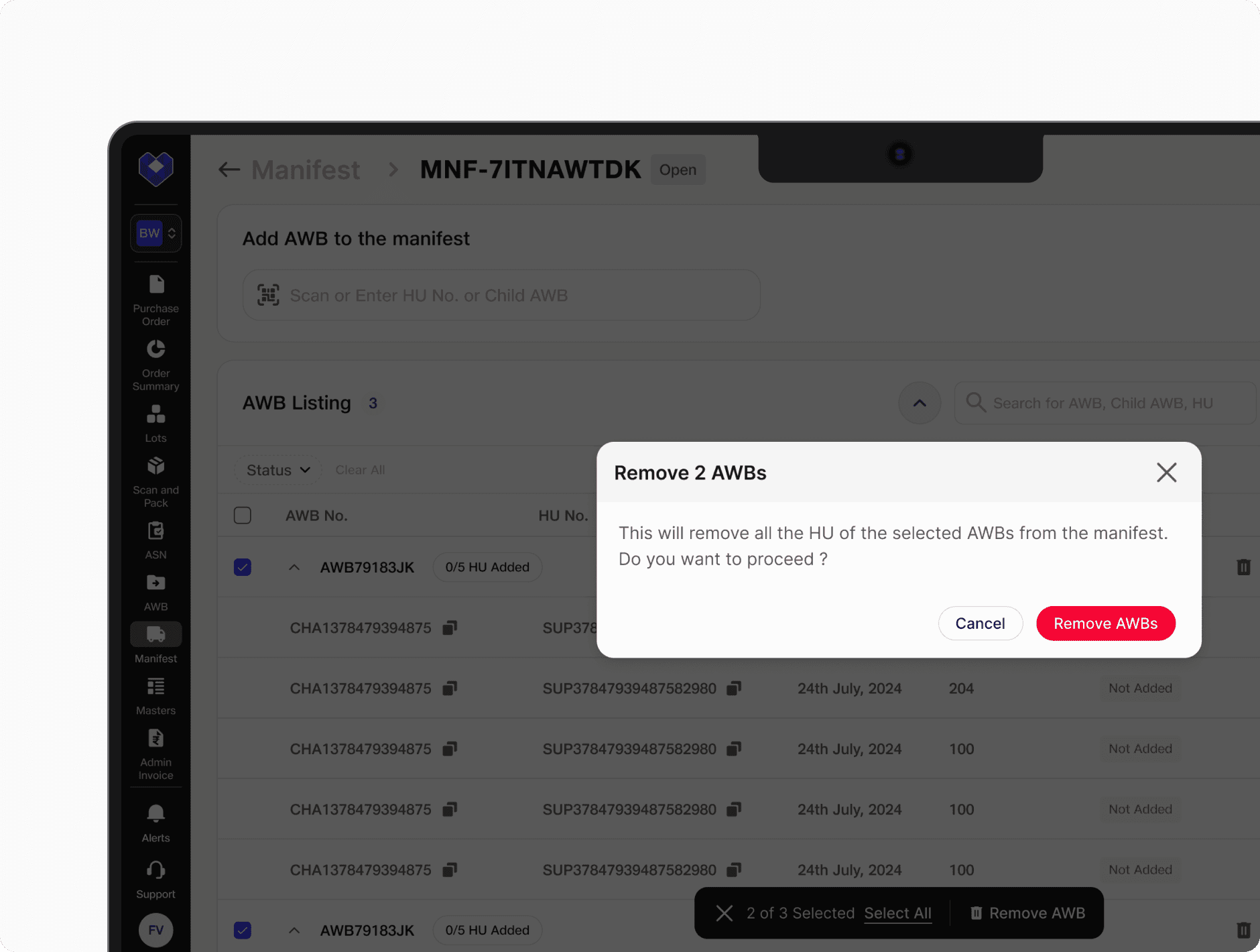 If packages become damaged or misplaced after being packed, vendors can remove them in bulk, accelerating manifest finalization.