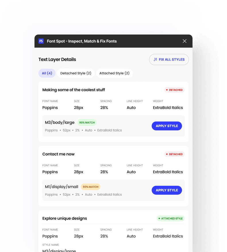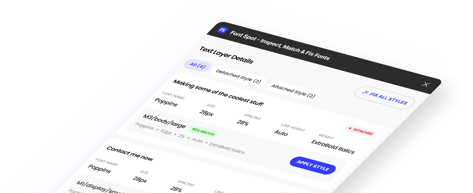I conceptualized, designed and developed Font Spot, a Figma plugin that automates the tedious process of font auditing and cleanup. The plugin allows designers to instantly analyze a frame, detect text layers that deviate from their design system, and fix inconsistencies with a single click, ensuring typographic consistency and saving significant manual effort.